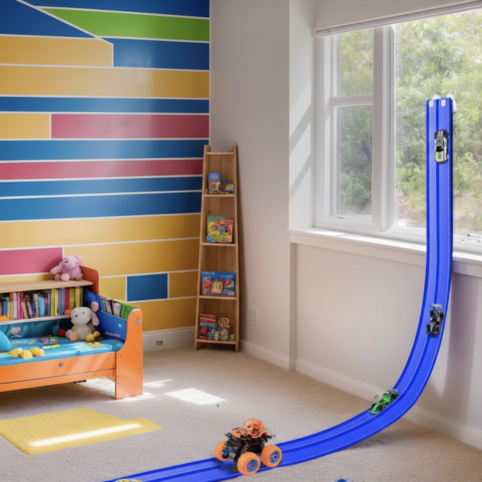 Den böjbara banan kan formas, rullas ihop och anpassas efter olika miljöer, vilket gör varje lekstund unik. Bilarna drivs av gravitation, och barnet kan experimentera med höjd, lutning och kurvor för att hålla bilen på rätt spår – ett lekfullt sätt att utveckla logiskt tänkande och problemlösning.