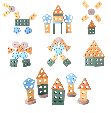 De färgglada klossarna i olika former uppmuntrar kreativitet och nyfikenhet samtidigt som de introducerar barnet till grundläggande koncept som formigenkänning och struktur. En pedagogisk och lekfull leksak som följer Montessori-metodens principer om självständig inlärning.