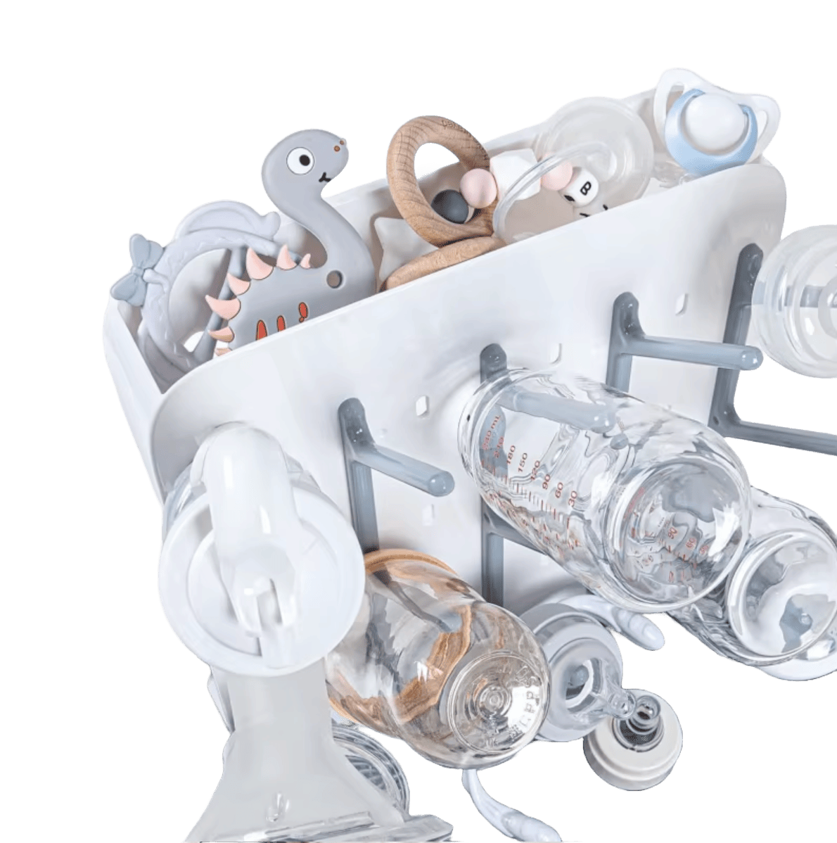 Torkstället fungerar även som en förvaringsbox för dina babyflaskor, nappar och tillbehör. Den kompakt designen gör att den passar perfekt på köksbänken eller i skåpet, vilket sparar plats samtidigt som den håller allt organiserat på ett snyggt sätt.