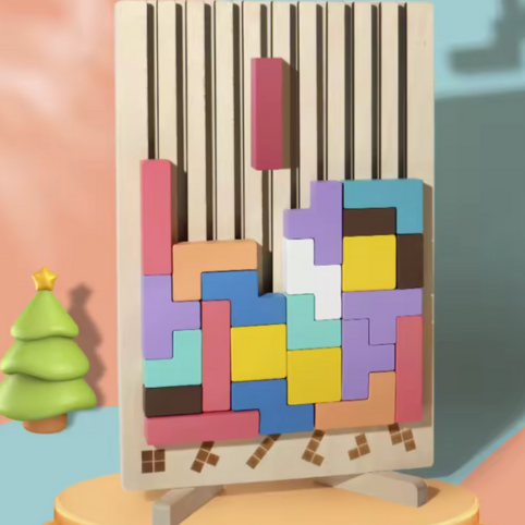 Pusslet består av färgglada träblock som kan kombineras på olika sätt för att bygga tredimensionella former och mönster. Genom att testa olika lösningar utvecklar barnet både problemlösningsförmåga och kreativitet, vilket gör detta till en rolig och lärorik aktivitet för hela familjen.